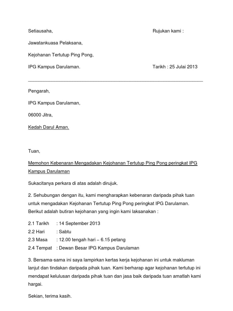 Contoh surat meminjan aset kerajaan. Penutup - terima kasih - tandatangan Setiausaha Persatuan Bahasa Melayu Sekolah kebangsaan Pandan Indah 55100 Pandan Indah Kuala Lumpur. Contoh surat pohon sumbangan dalaman sekolah untuk program lawatan pohon sumbangan koperasi kantin dewan makan dan ketua.